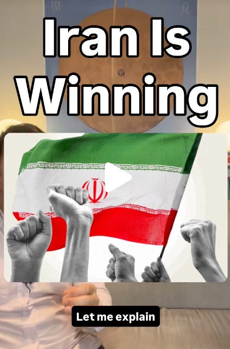 And the stuff I’ve seen on TikTok and Instagram about this war is so unhinged I don’t even know where to begin. Many people have convinced themselves that Tel Aviv is being actively destroyed and the US has been routed from the region already.