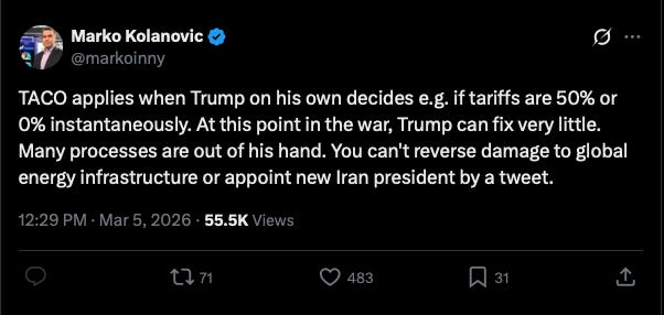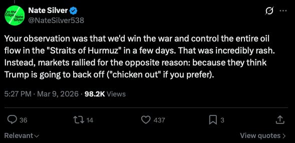 Unlike narrative 1, where I can broadly shrug and point to social media, or narrative 2, where we can look at what the administration is saying, narrative 3 is more difficult to pin down concretely. If I mention a quote from, say, Nate Silver, someone can easily counter it with one from a think tank saying something else. But I think enough of the core DNA is shared that it makes for a coherent story. Namely, the belief is that we have blundered into an unwinnable war and that Trump will have no choice but to back down in the next couple of weeks to avoid disaster, or if he doesn’t back down face disaster directly. Additionally, even if we somehow manage to walk away and claim victory, the cost to the international system and American prestige has been so high that we have permanently degraded our global standing.
