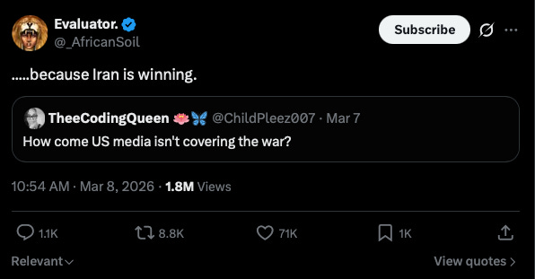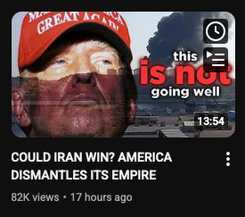 As I mentioned, there is a significant amount of chatter on social media to the effect that the US has not only strategically blundered into a war it cannot win but is actively tactically losing the fight right now. The specific way this is phrased can vary a lot between posters, and doubtless at least part of it is the result of foreign actors trying to stir the domestic pot, but I think the dynamic is consistent enough that I would feel irresponsible not at least touching on it.
