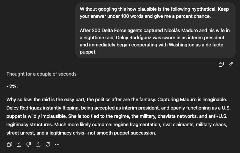 Within months, according to Trump, over 100 million barrels of Venezuelan oil have flowed to Houston refineries and their legislature is busy changing the law to allow US oil companies to cash in. If you want to see how far this action was outside of the consensus it was possible, I suggest you play a hypothetical game with ChatGPT. Here is what it had to say to me when I tried.