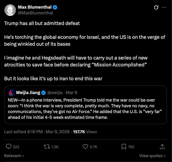 This is important because the models of reality they each present are fundamentally incompatible. Either 1) the US is tactically losing the war, or 2) we have just “concluded” a Desert Storm–level military success, or 3) we have set off a global catastrophe and Trump is about to back down in the face of resurgent Iranian might, allied and domestic pressure, and an oil shock. There is no way to know right now with certainty what will happen; only time will reveal that.