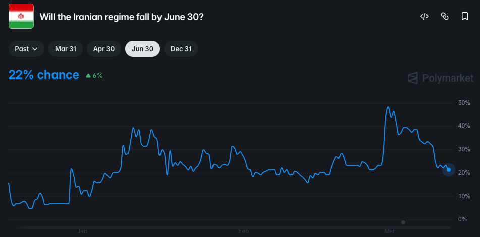 Polymarket largely agrees with this, only pricing in roughly a ¼ chance of regime collapse.