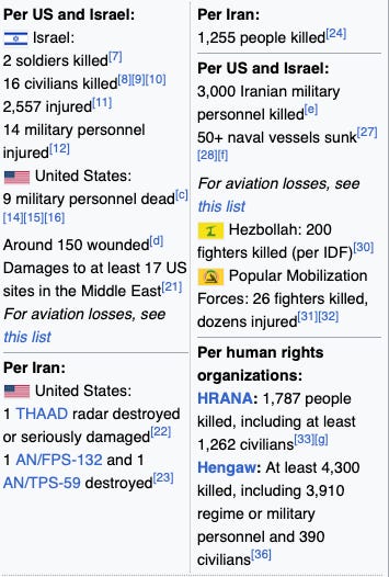 This would amount to functionally the entire Iranian navy and air force, along with a huge slice of their leadership class. In fact, the numbers obscure the scale of Iranian losses because what is not shown is damage to their launchers and military industrial complex, both of which have been extensive.
